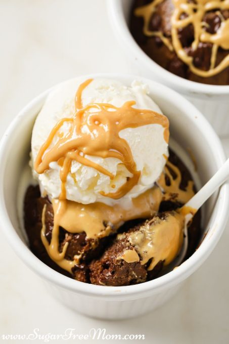 Super easy dessert to whip up. Serve with keto ice cream, yogurt or whipped cream and an optional peanut butter drizzle.