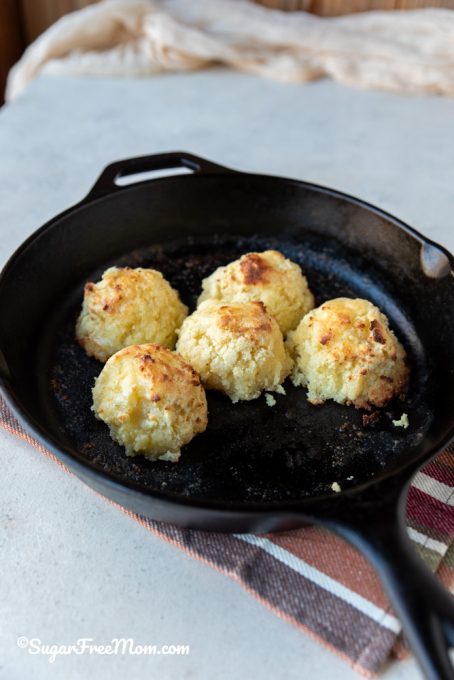 The best part about this low-carb biscuit is how simple it is to just throw all the ingredients into your food processor, make mounds and bake in a buttered cast iron skillet or a prepared baking sheet pan if you don't have a cast iron.